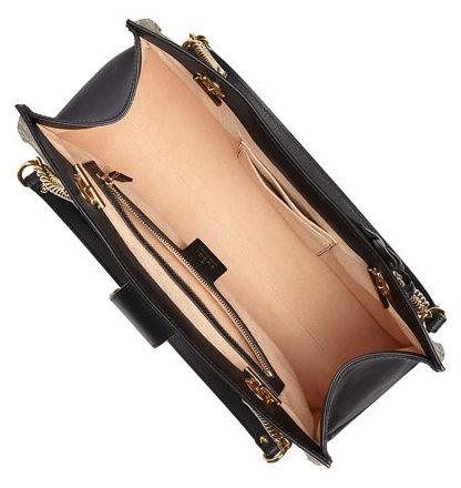 This shoulder bag in GG Supreme canvas with gold bees print and leather detail. Double leather and chain shoulder straps; 9.5" drop. Open top with flap-over padlock closure; hanging covered key. Interior; microfiber lining; one zip and two open pockets. 9"H x 13.5"W x 6.6"D.
